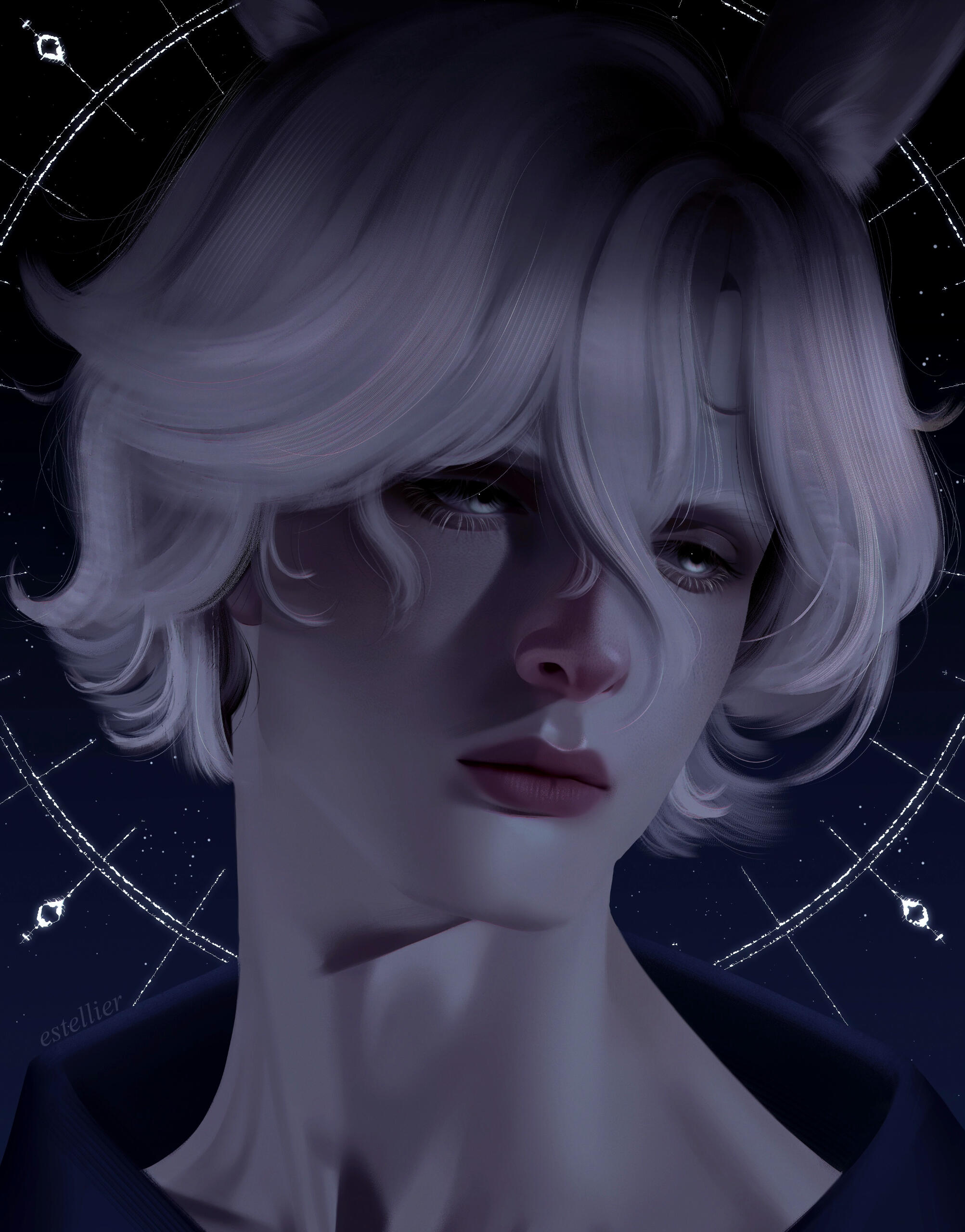 Rensen's looks are indisputably Veena with his silvery hair and pale skin. Much like those hailing from the Lomen tribe, he is virtually invisible when stood amongst a snowy backdrop. This proves to be advantageous during hunts, as most animals—and people—don't see him coming until he's already ambushed them. He prefers colder climates for this reason, and because it reminds him of his homeland.Messy hair rests upon his forehead. Rensen cares little for keeping a conventional appearance as the concept of various social expectations fail to make sense to him, nor does it generally impact his daily life anyways. Most of his wardrobe consists of light cloths, preferring to be light on his feet incase he needs to start a chase or flee.While almost always covered, scars litter Rensen's body, especially his chest. If asked about them, he'll remain quiet, unwilling to share their history.